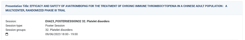 Session:32.Platelet disorders Time: 18:00-19:00, June 8, 2023